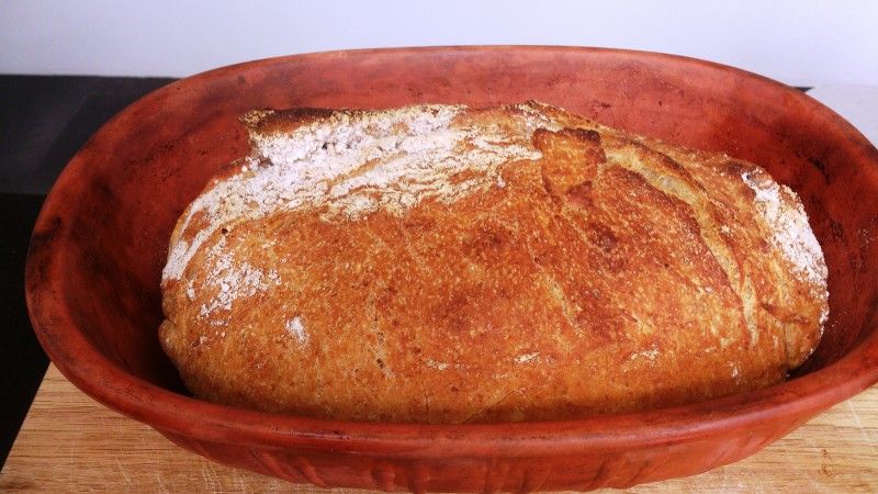 Vi laver dette brød i Römertopf i stedet for at bage det direkte i ovnen. Fordelen er at brødet beholder mere, af sit naturlige fugtindhold, og derved bliver mere svampet indeni og sprødt udenpå.