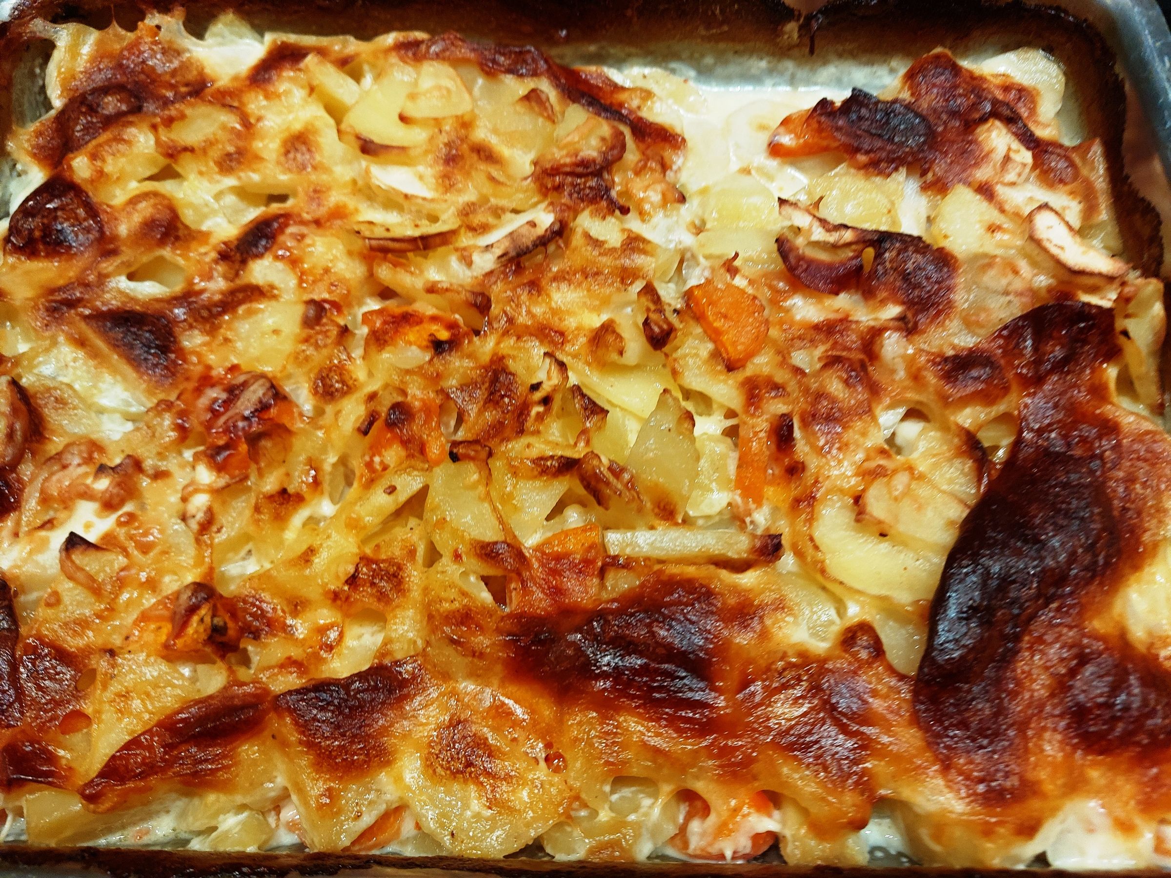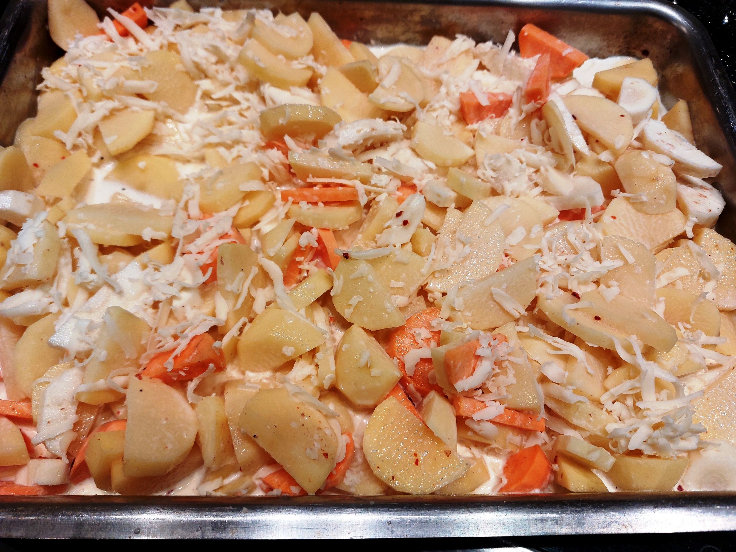 - Smør et ovnfast fad ind i lidt smør. Læg et lag af de tynde skivede kartofler og rodfrugter. Fordel lidt ost, løg, hvidløg, timian, revet muskat, salt og peber. Gentag lagene til ingredienserne er brugt op.