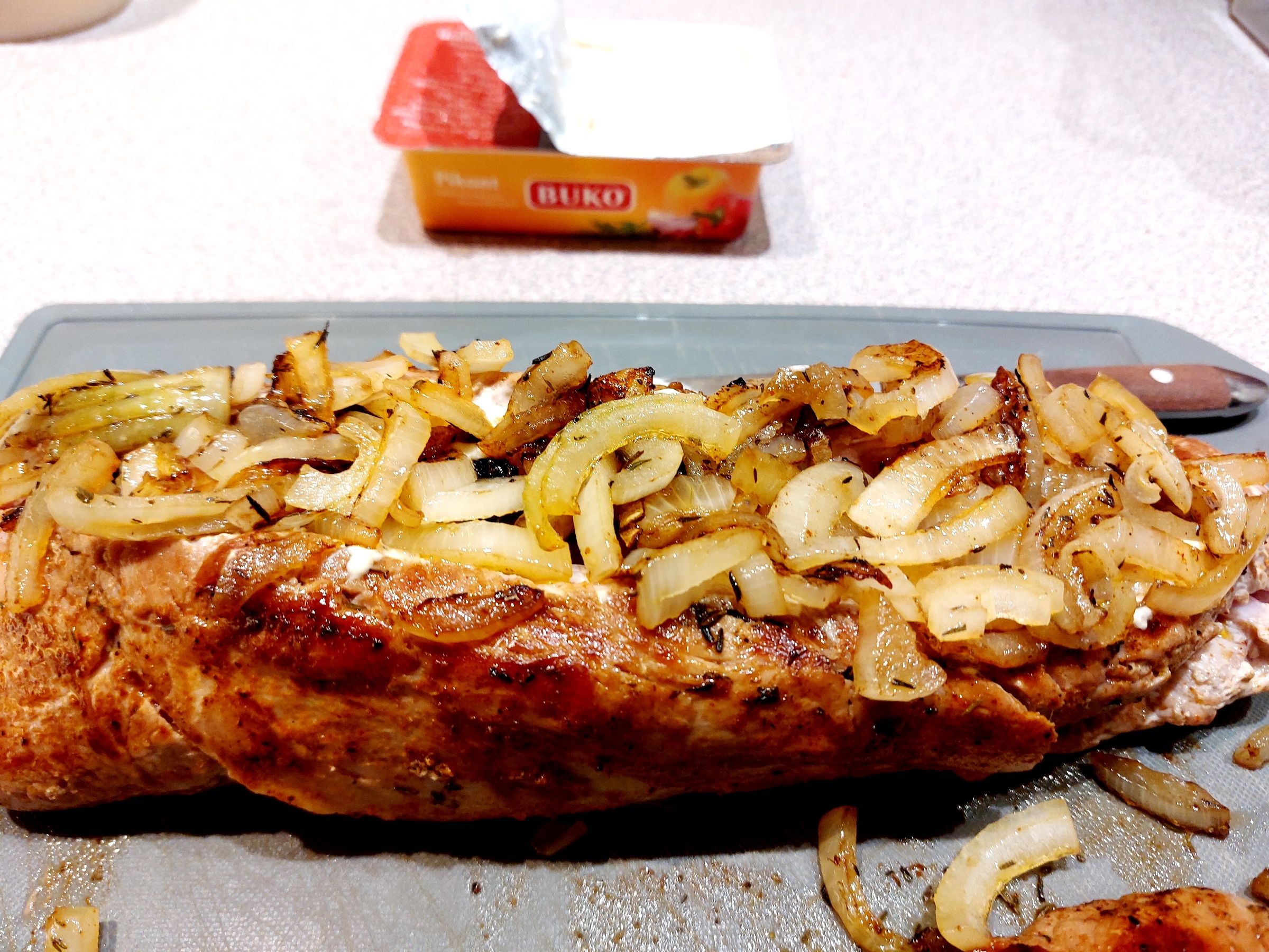 - Fordel fyldet i rillen på mørbraden. Tilsæt klatter af pikant ost og tryk det lidt ned i fyldet.