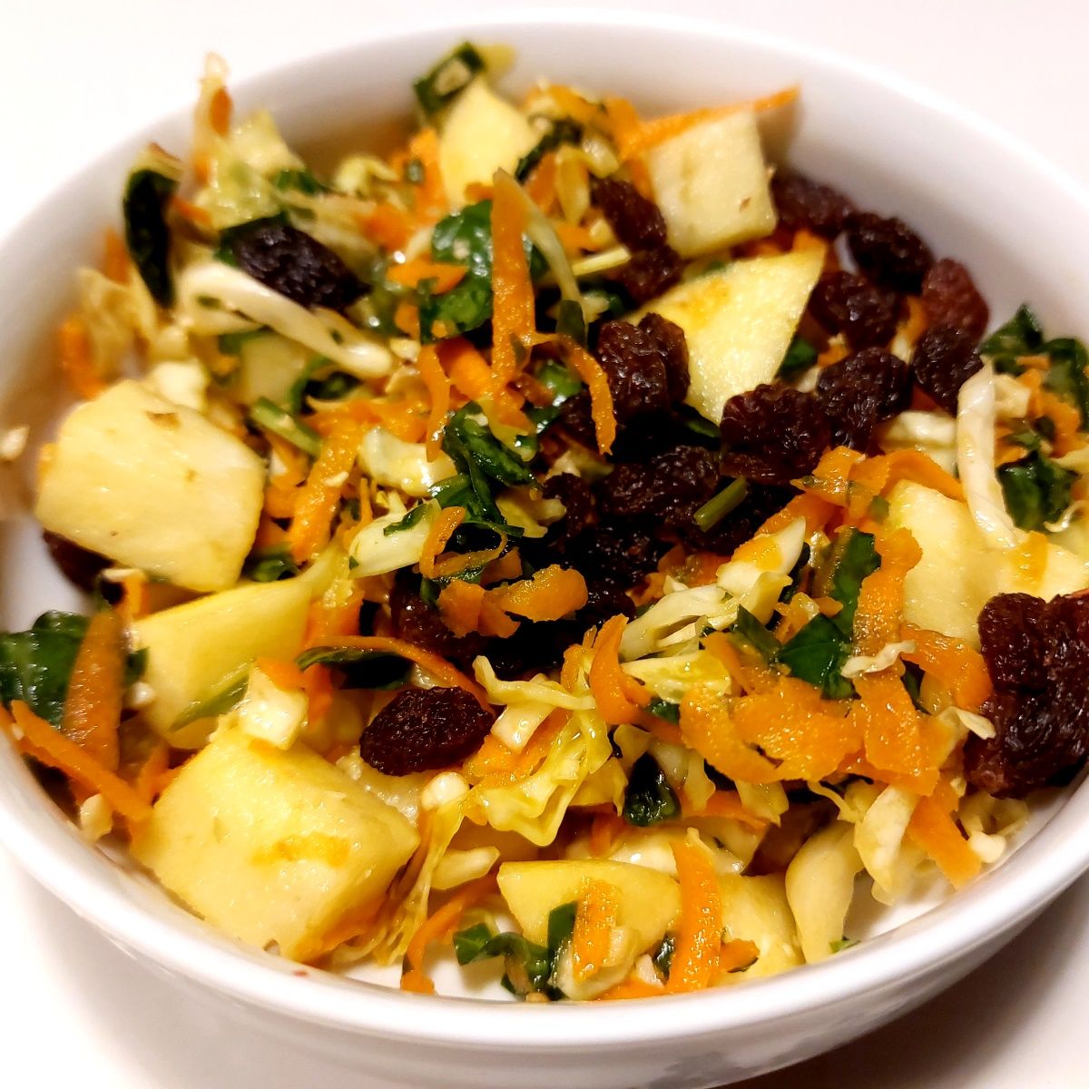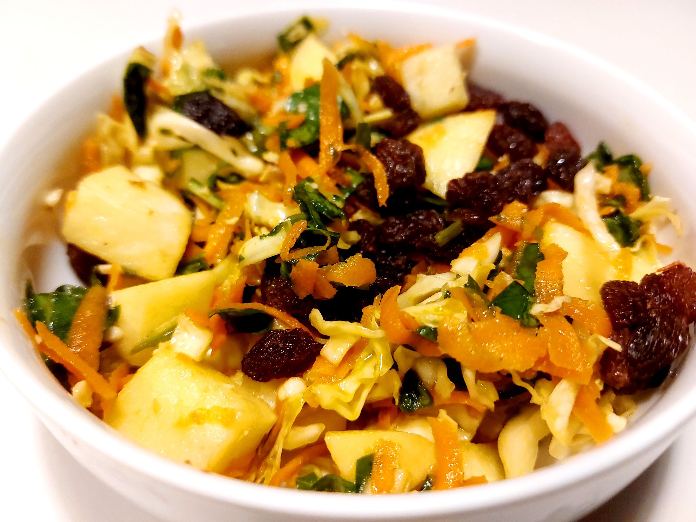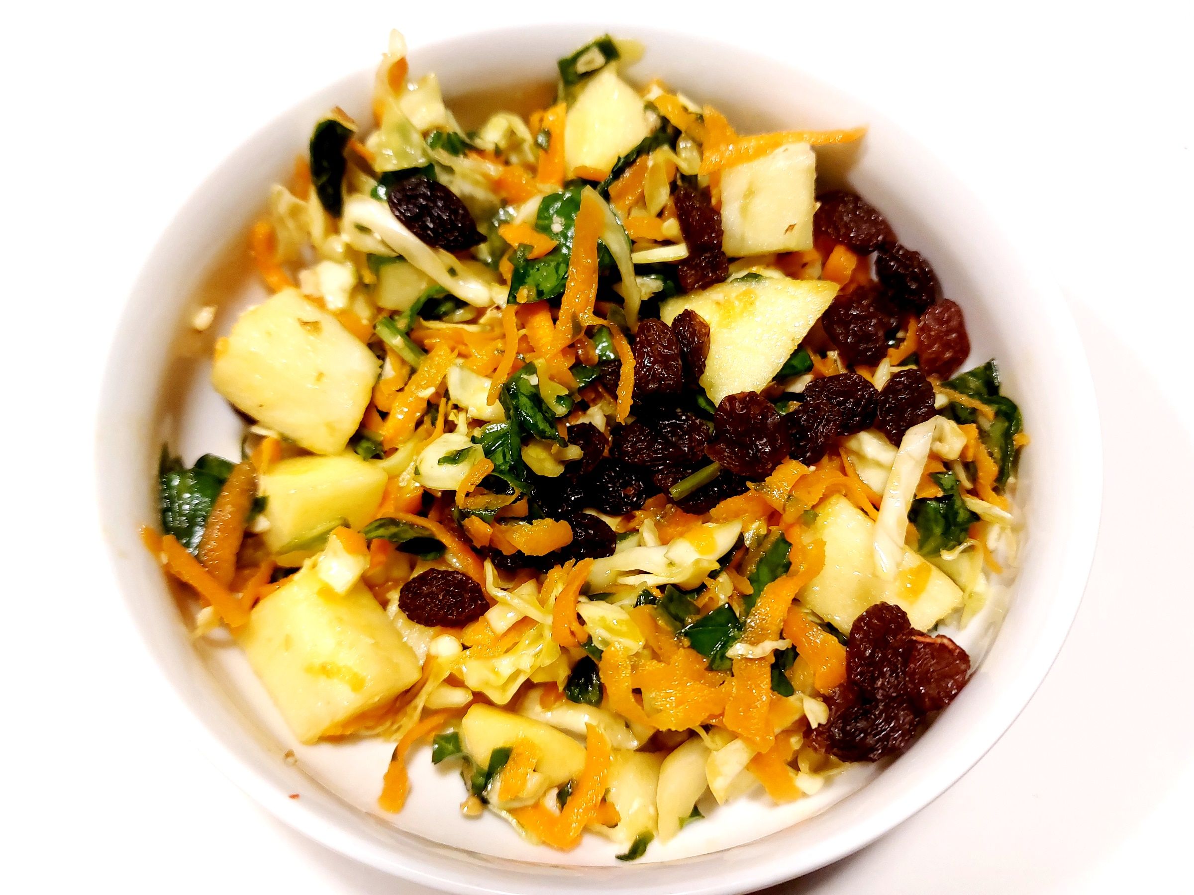 En frisk og sprød kålsalat med spidskål, spinat, søde æbler, mango, rosiner og gulerødder, vendt i en syrlig og let dressing af citronsaft og olivenolie.